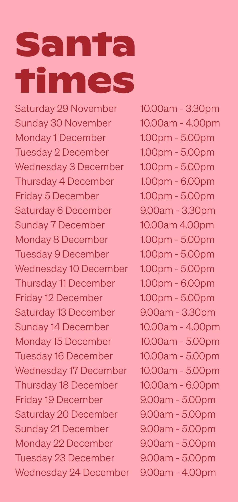 You can visit Santa between times below or book online to secure your perfect session. Choose from a variety of photo packages to suit your family’s needs.